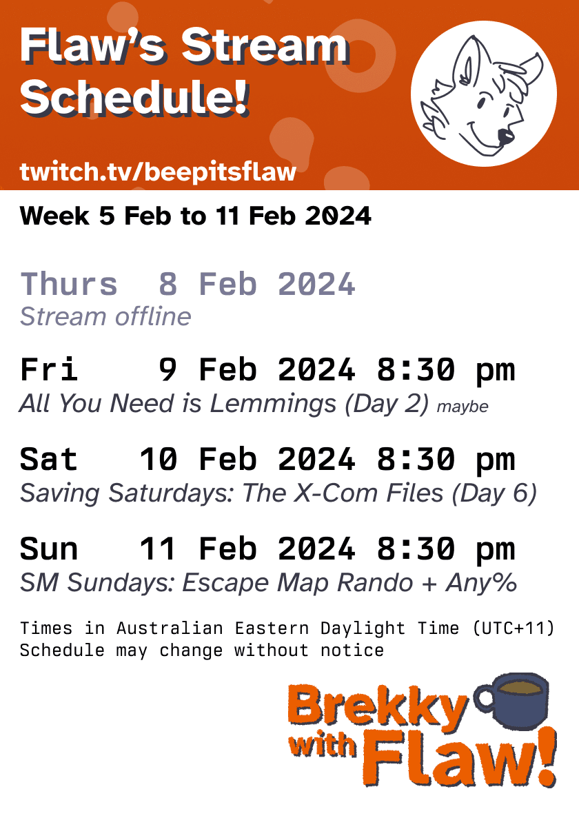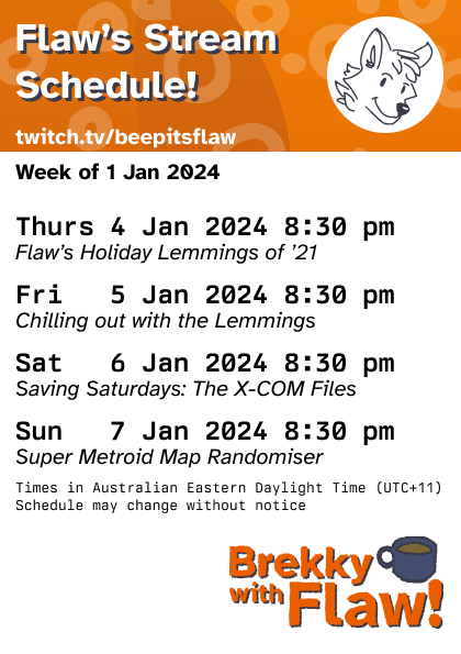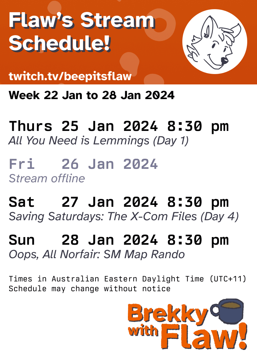 Stream schedule’s up! Because of public holiday stuff we can’t do our regular timeslot on Friday. Lemmings is gonna happen earlier on Thursday to make up for it!