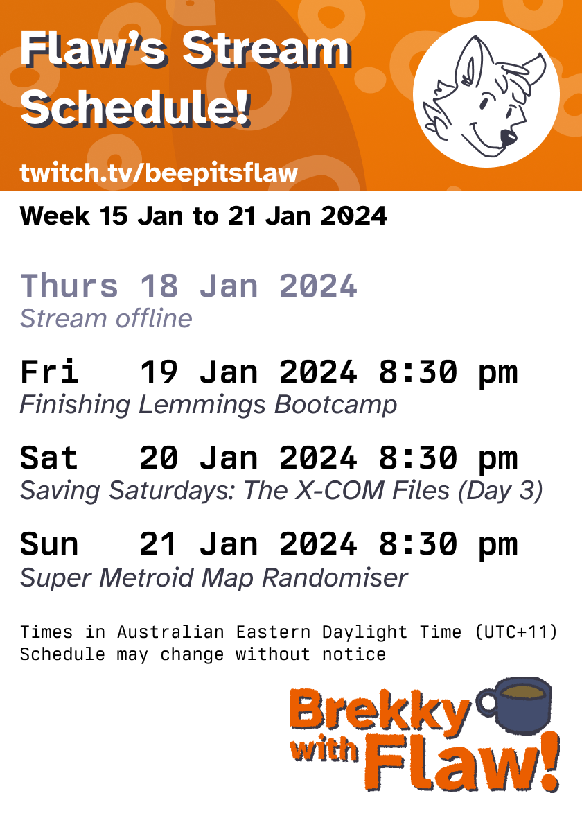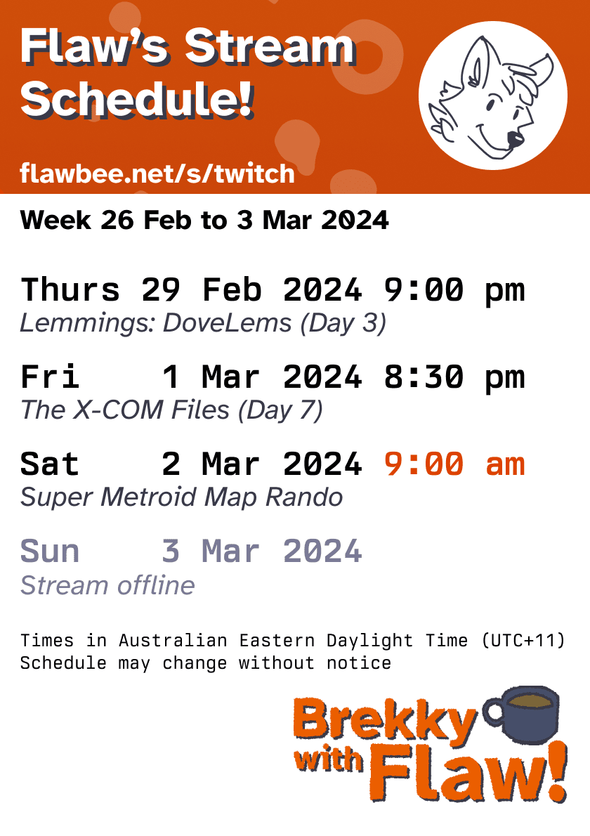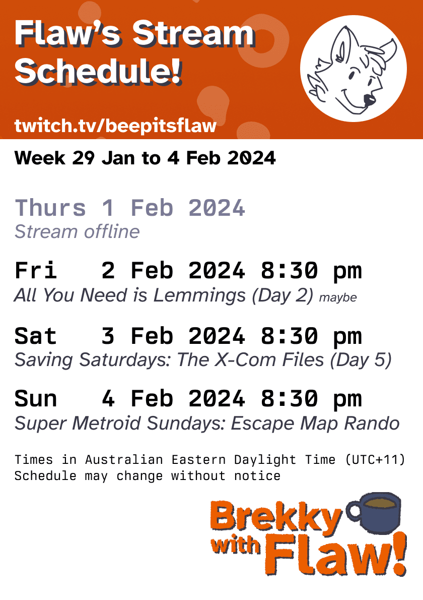 Stream schedule is late but here it is! There’s some stuff happening this weekend so we’re starting on Thursday with Lemmings, X-COM on Friday, and a ultra-late™ edition of SM Map Rando on Saturday!