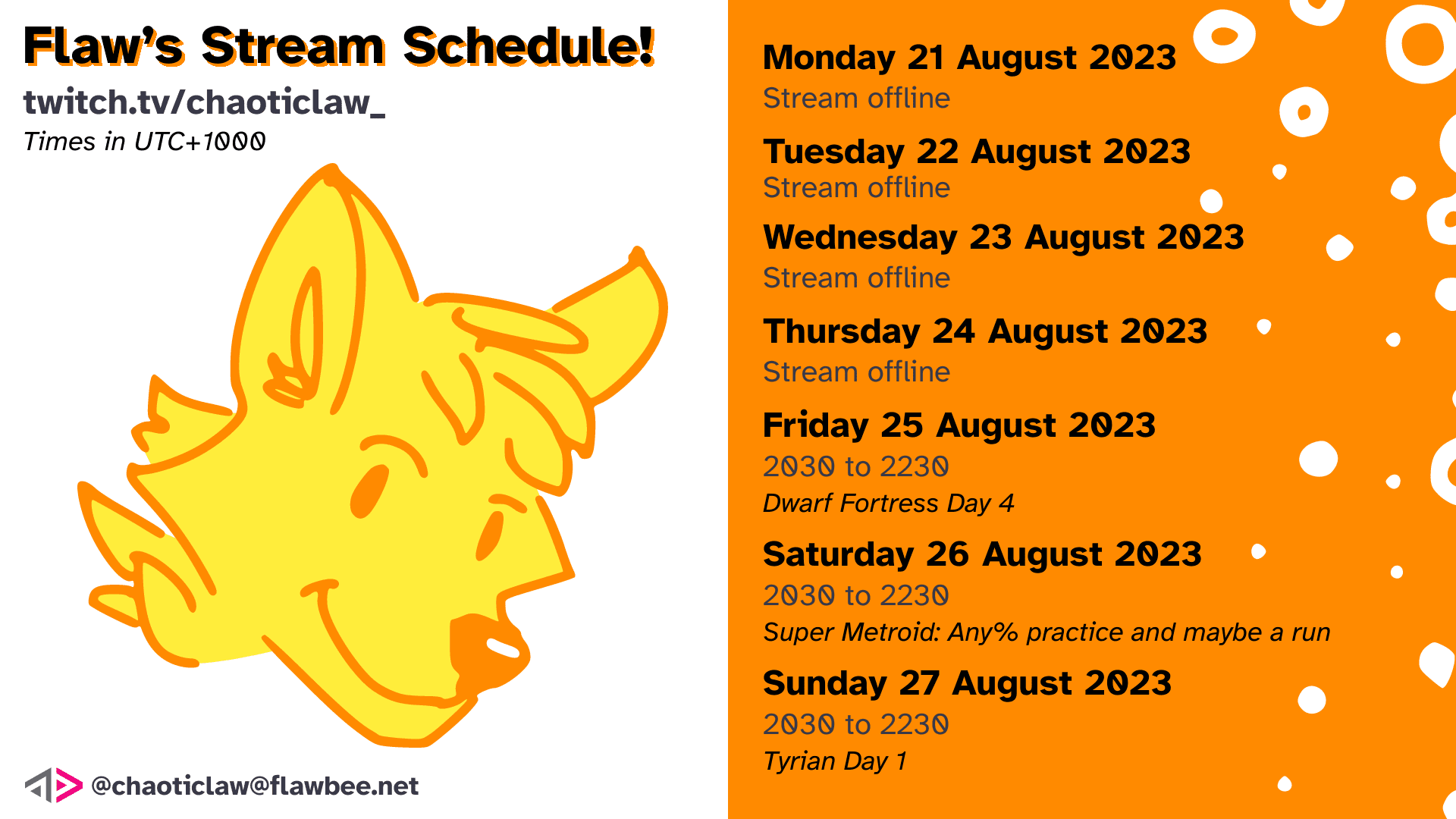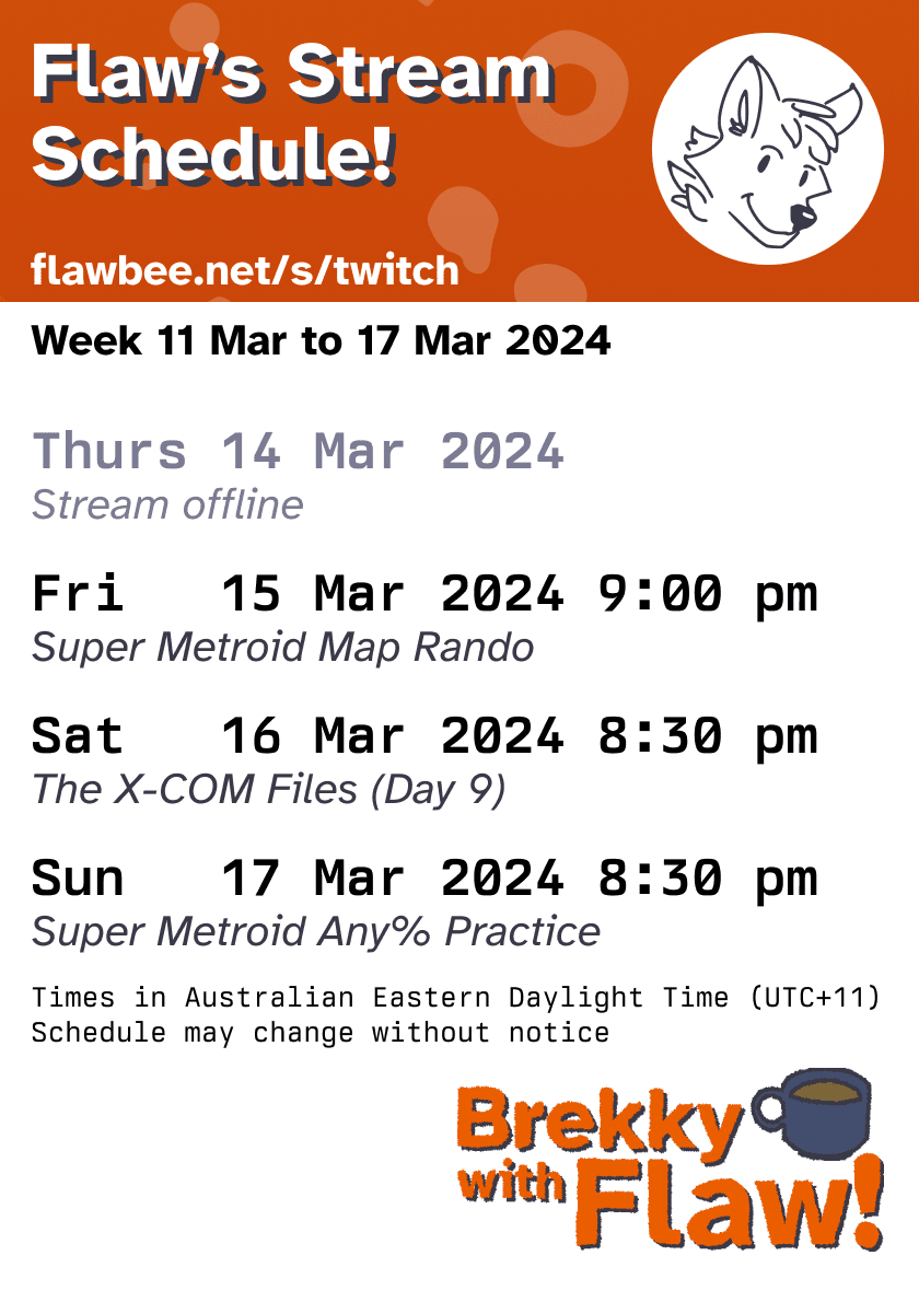 Stream schedule for the week and we’re gonna try and get Map Rando done on Friday this time! Some other stuff’s happening that day but hopefully I’ll have the energy for a good time!