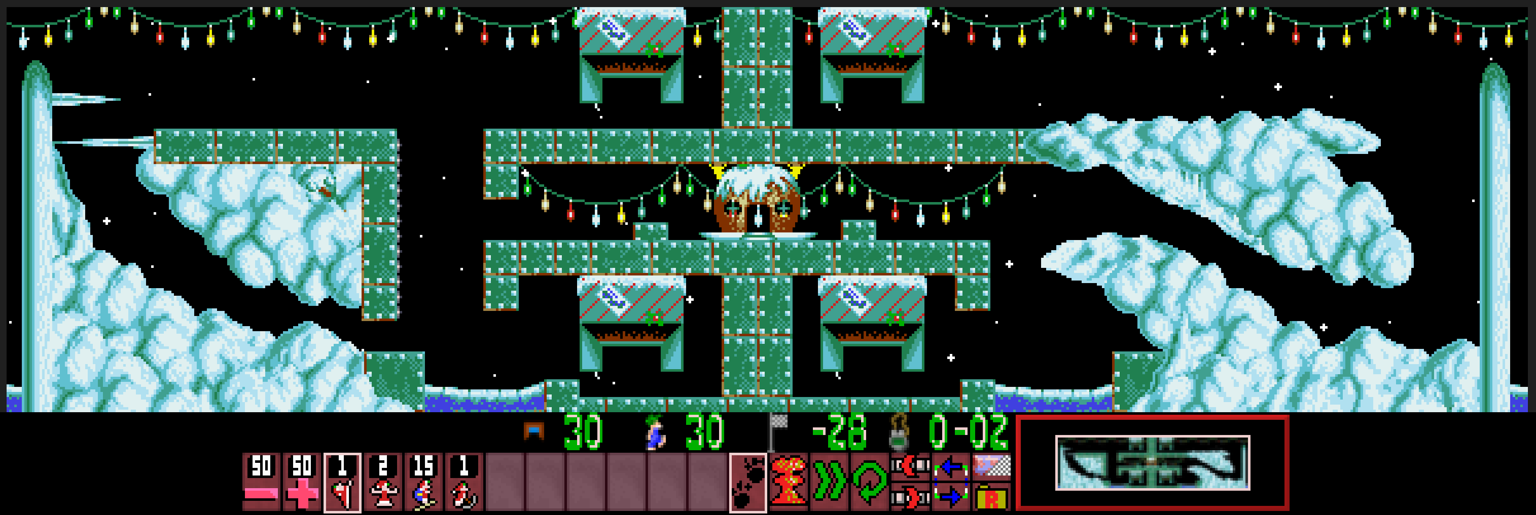As for my own explorations, this Christmas Lemmings pack that I looked at on stream gave me some real trouble— this level took like an hour to solve after running into many brick walls, dropping the climber in the wrong location, and the fact that I had to save like 98% of Lemmings hurt me real bad lol