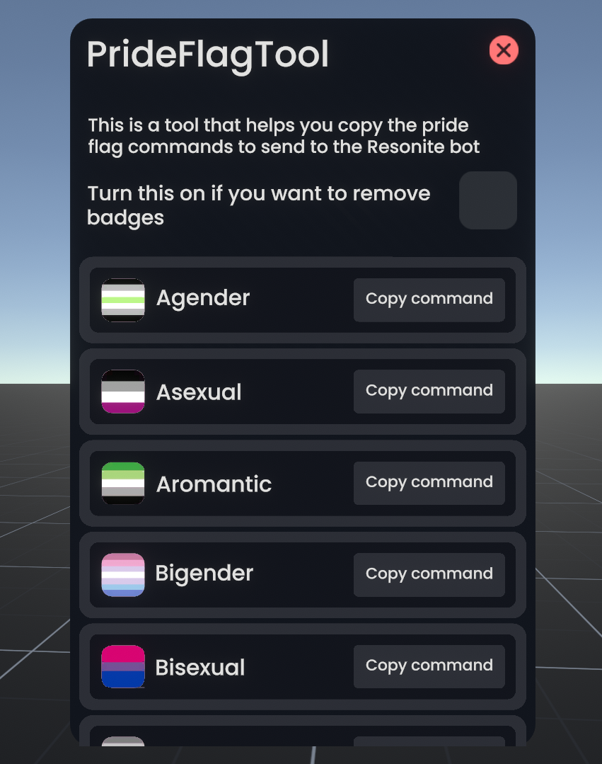all that you need to do is find the pride flag you want click "copy command" And it will automatically copy it to your clipboard and all that you need to do is send the command to the Resonite bot