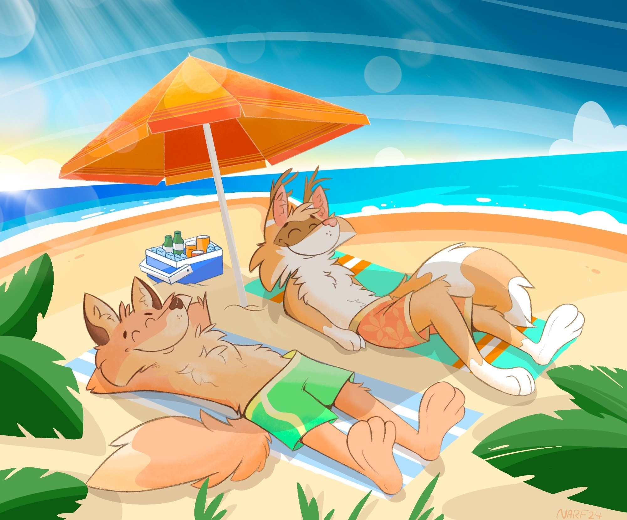 Narf and I are at the beach! Enjoy the outdoors, the summer isn't over! Loveliest art by @Narf_Raccoon 🦊🏖️🦝